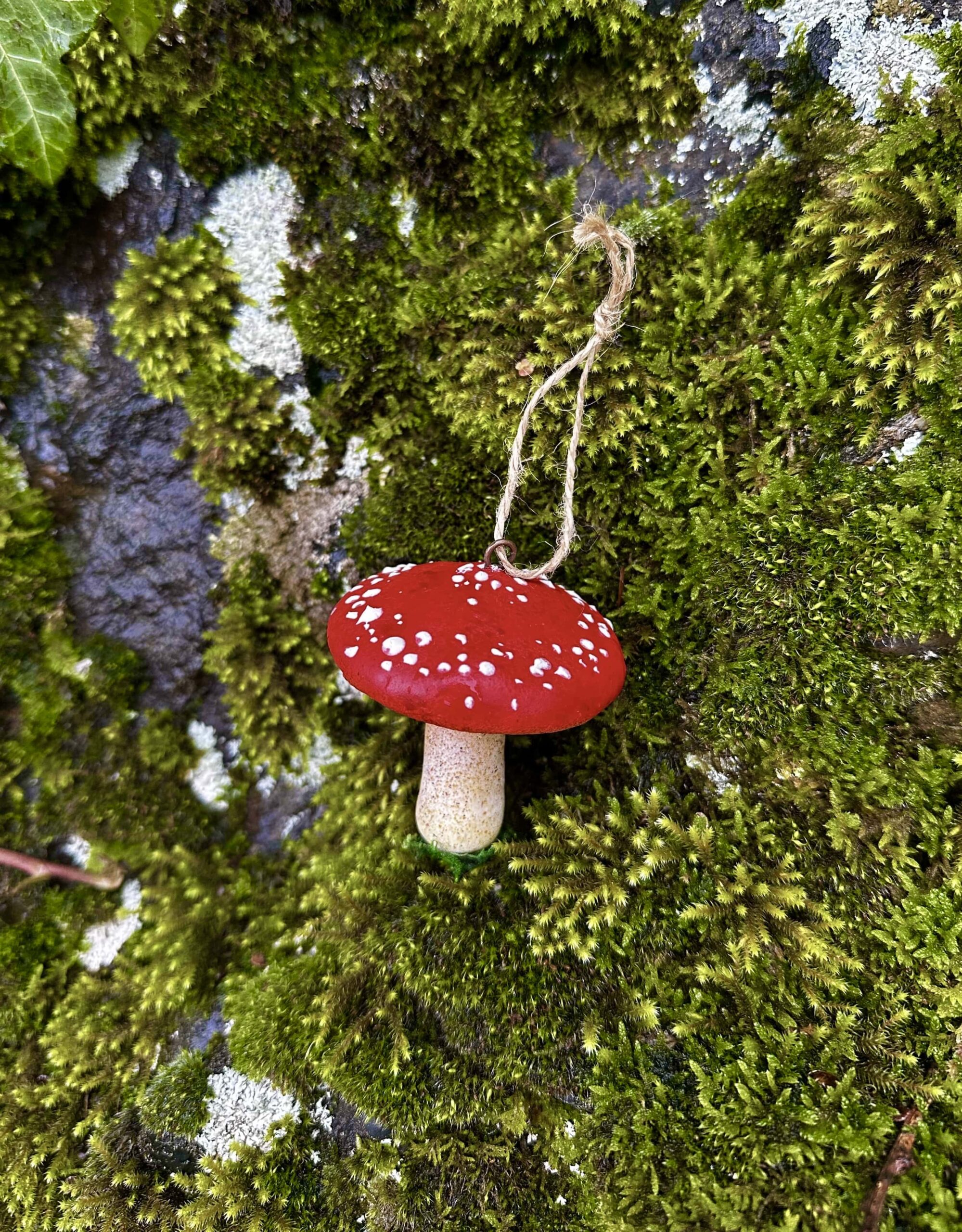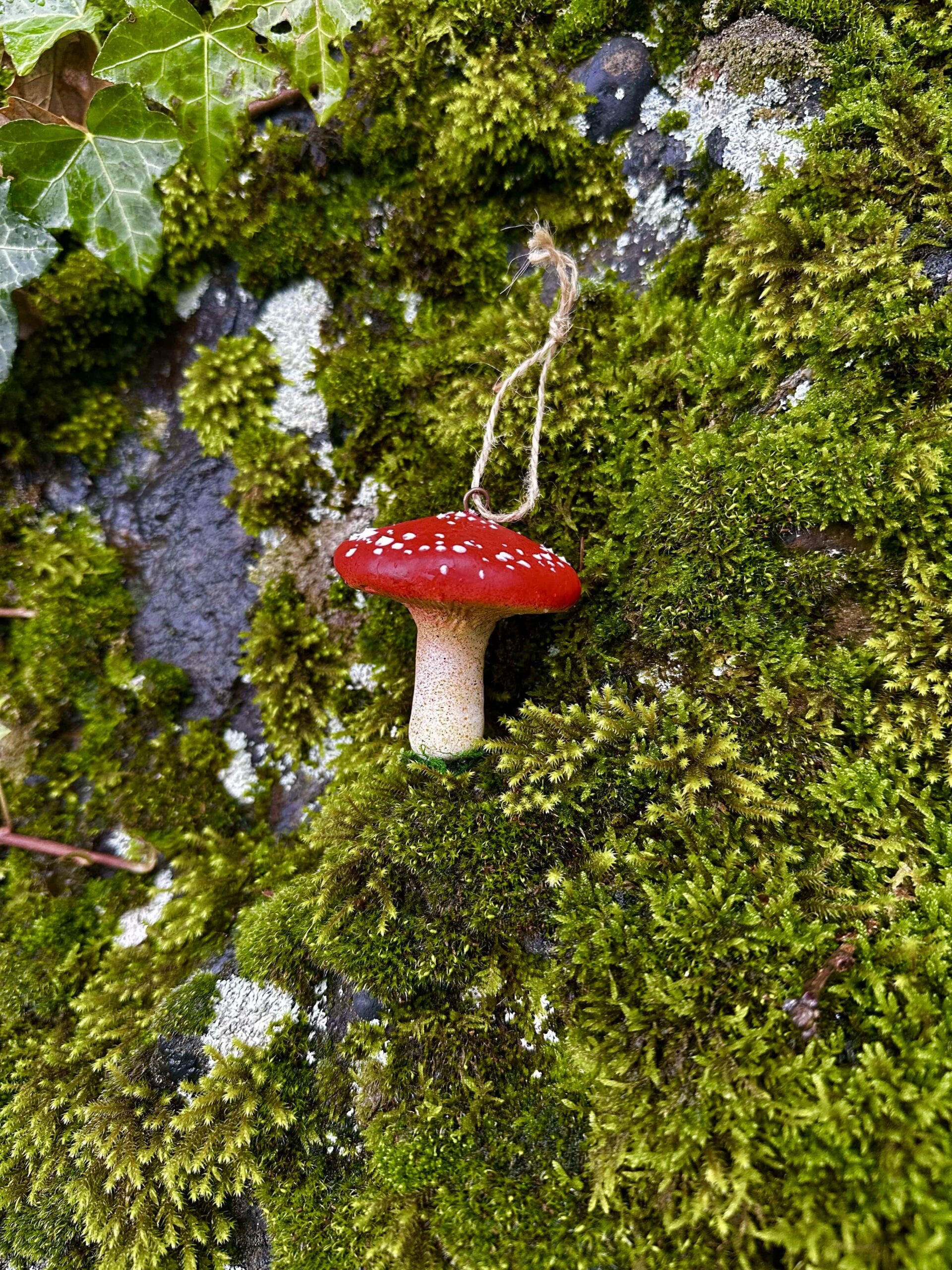 Petit champignon décoratif en Argile Mousse, entièrement modelé, peint et vernis à la main . La matière est extrêmement légère, et permet d’éviter de peser lourd sur les branches du sapin pour Noël !