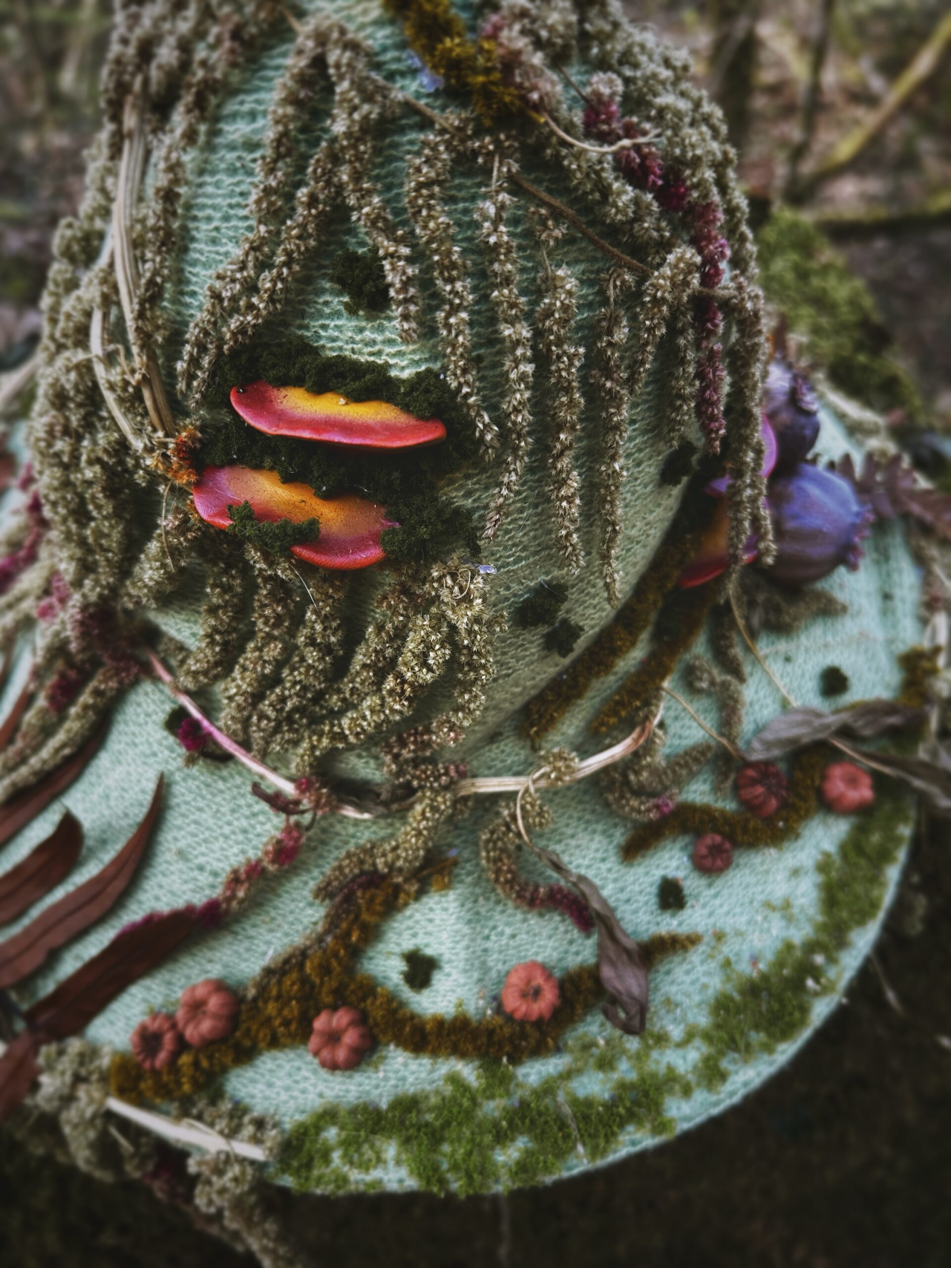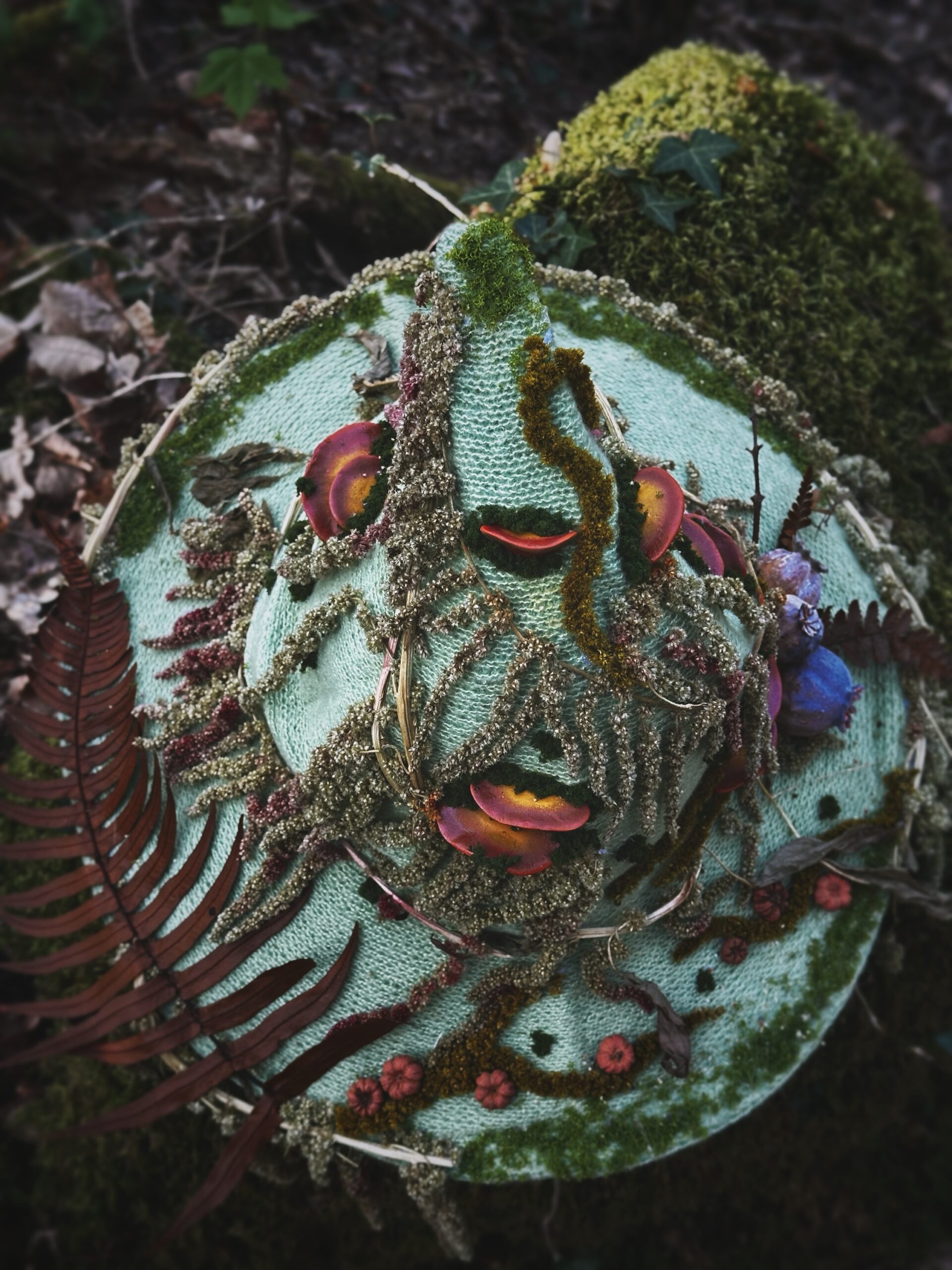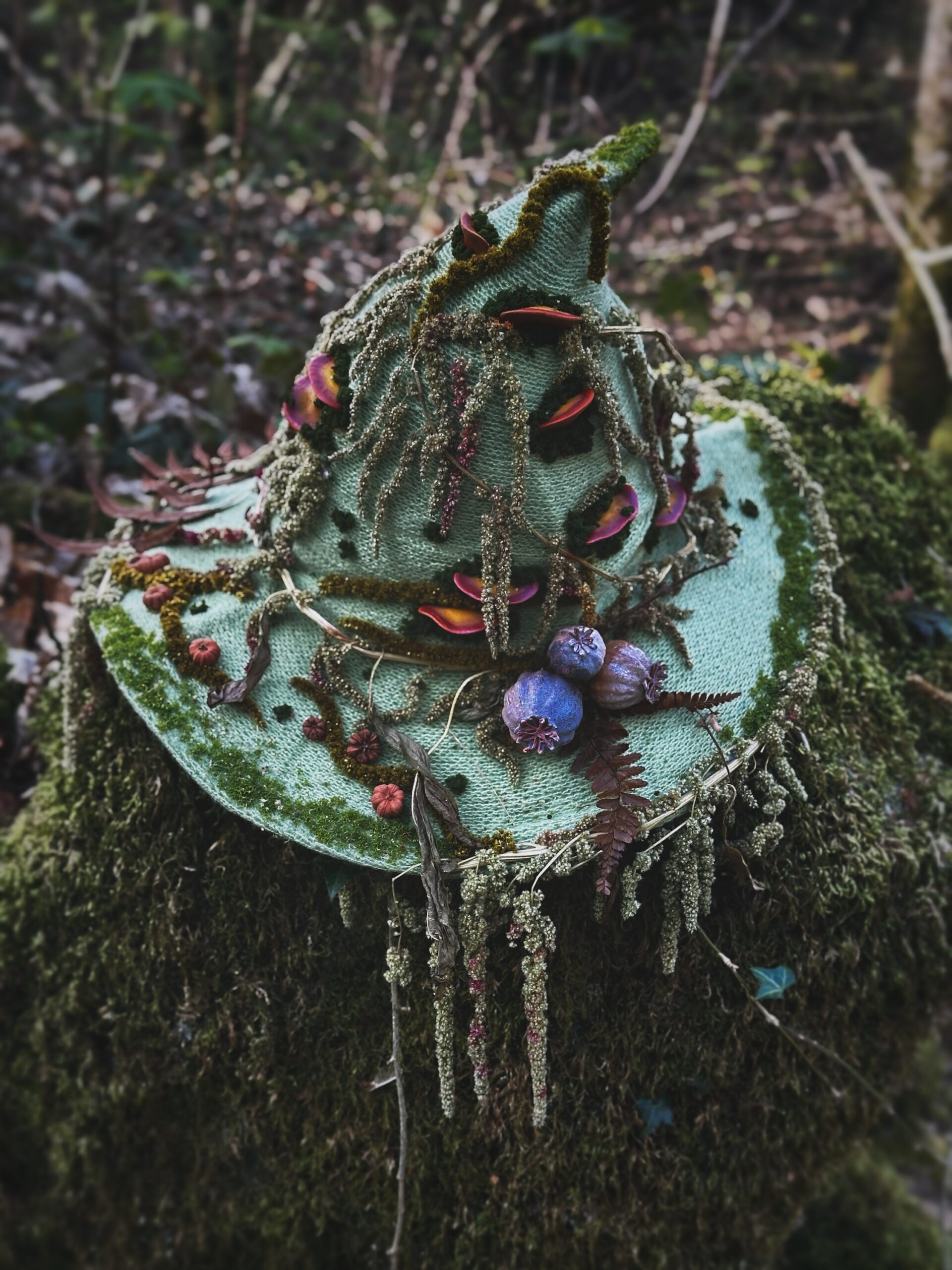 Chapeau de sorcière unique , entièrement agrémenté main avec des éléments naturels issu de mon jardin ou des forêts du Morvan près de la roche aux fées . Les éléments imités sont modelés et peints à la main.