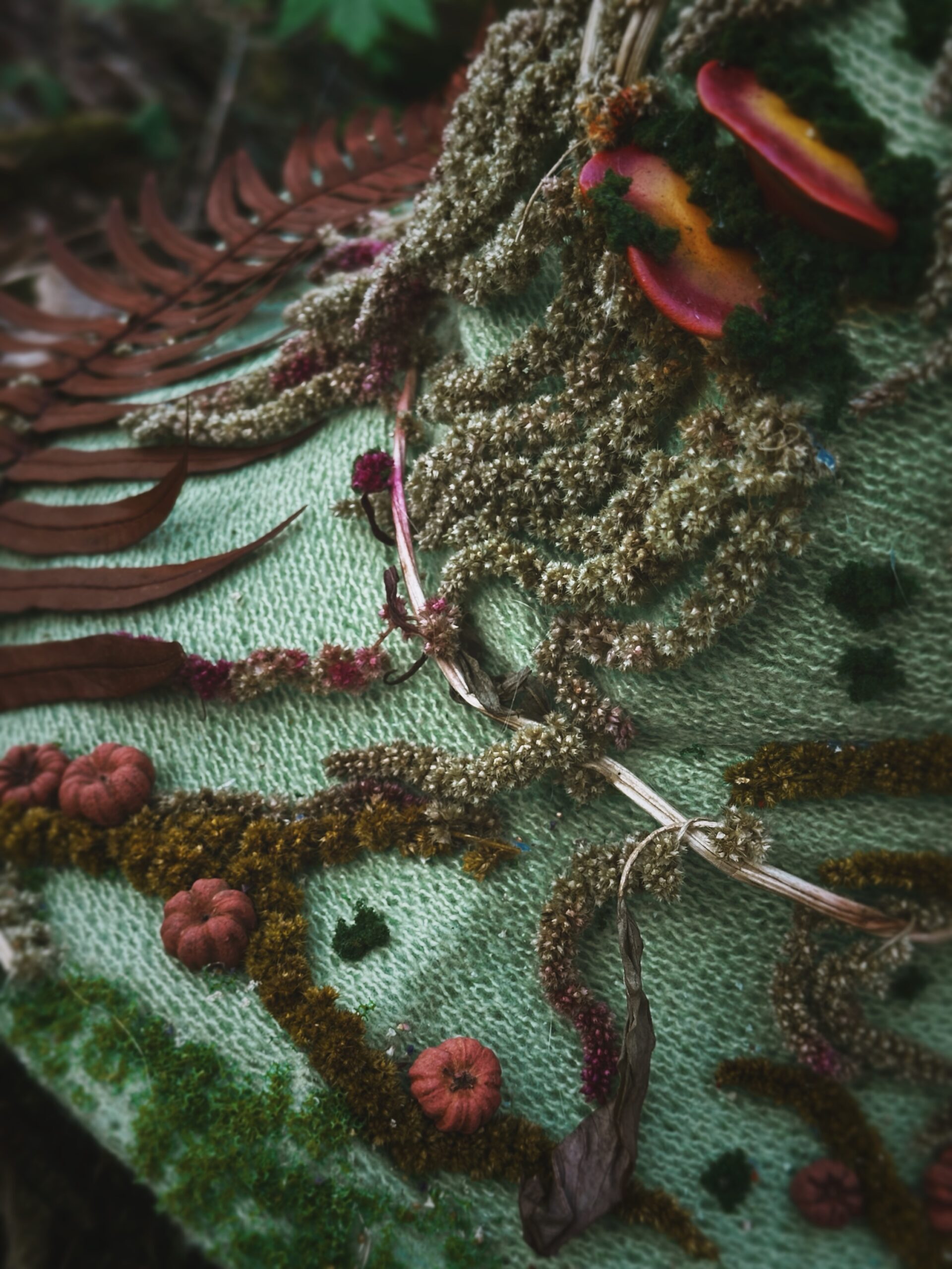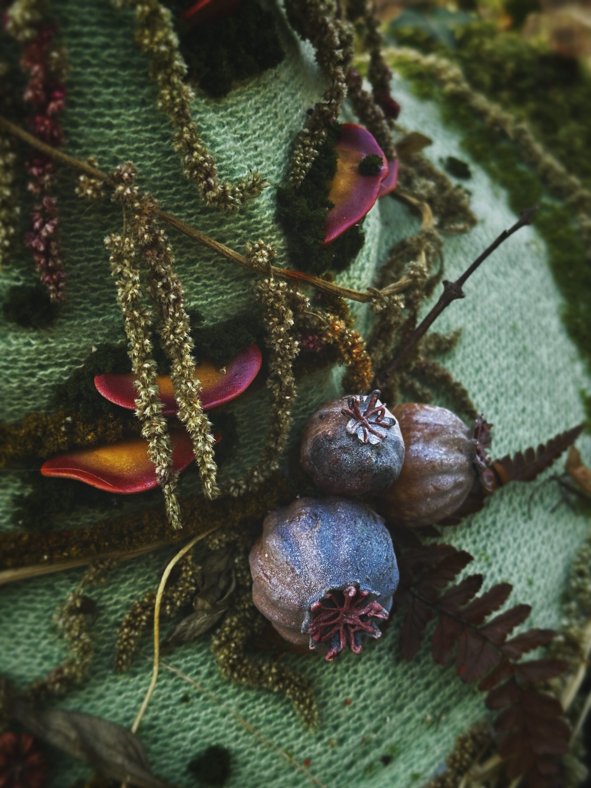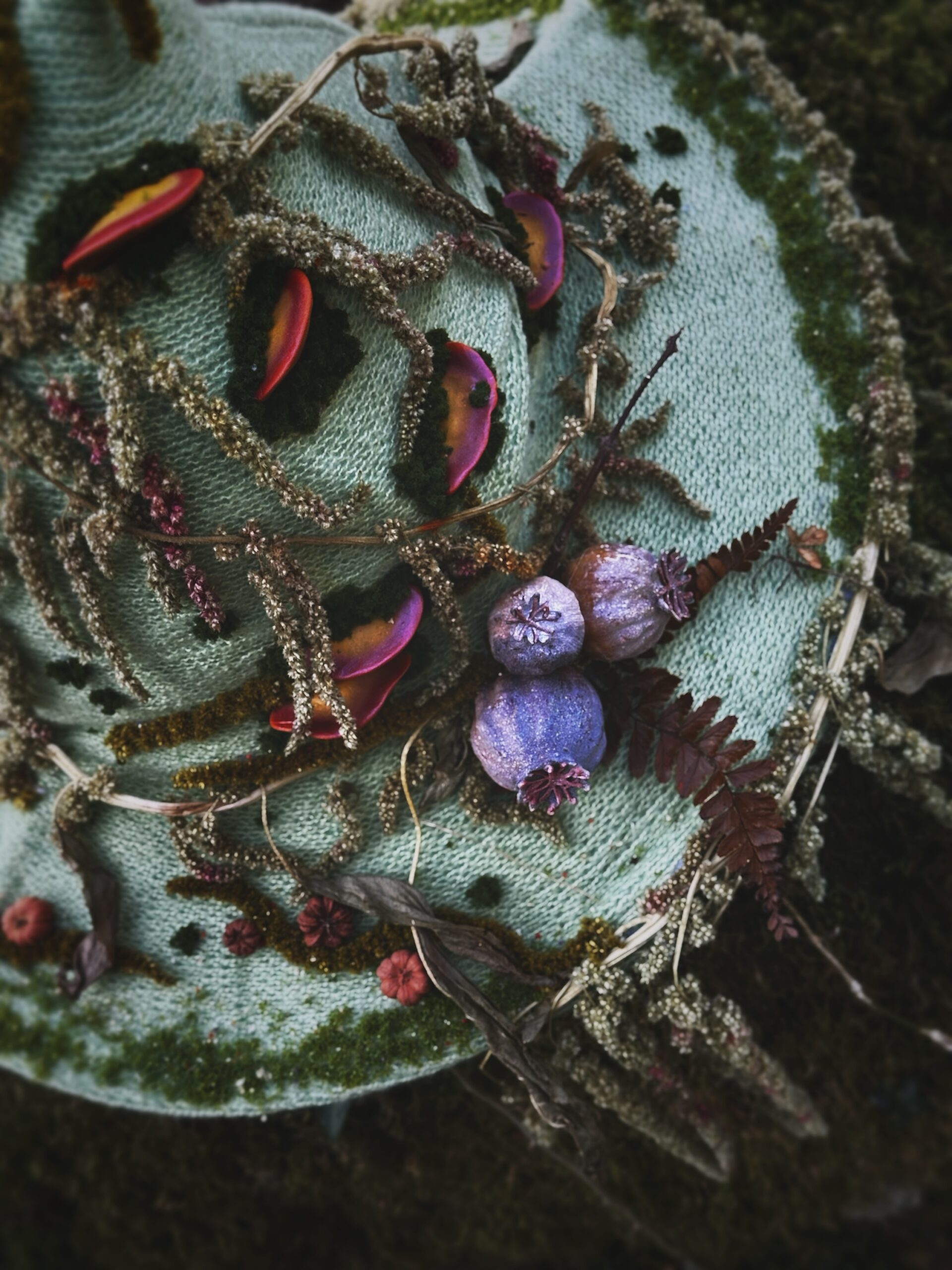 Chapeau de sorcière unique , entièrement agrémenté main avec des éléments naturels issu de mon jardin ou des forêts du Morvan près de la roche aux fées . Les éléments imités sont modelés et peints à la main.
